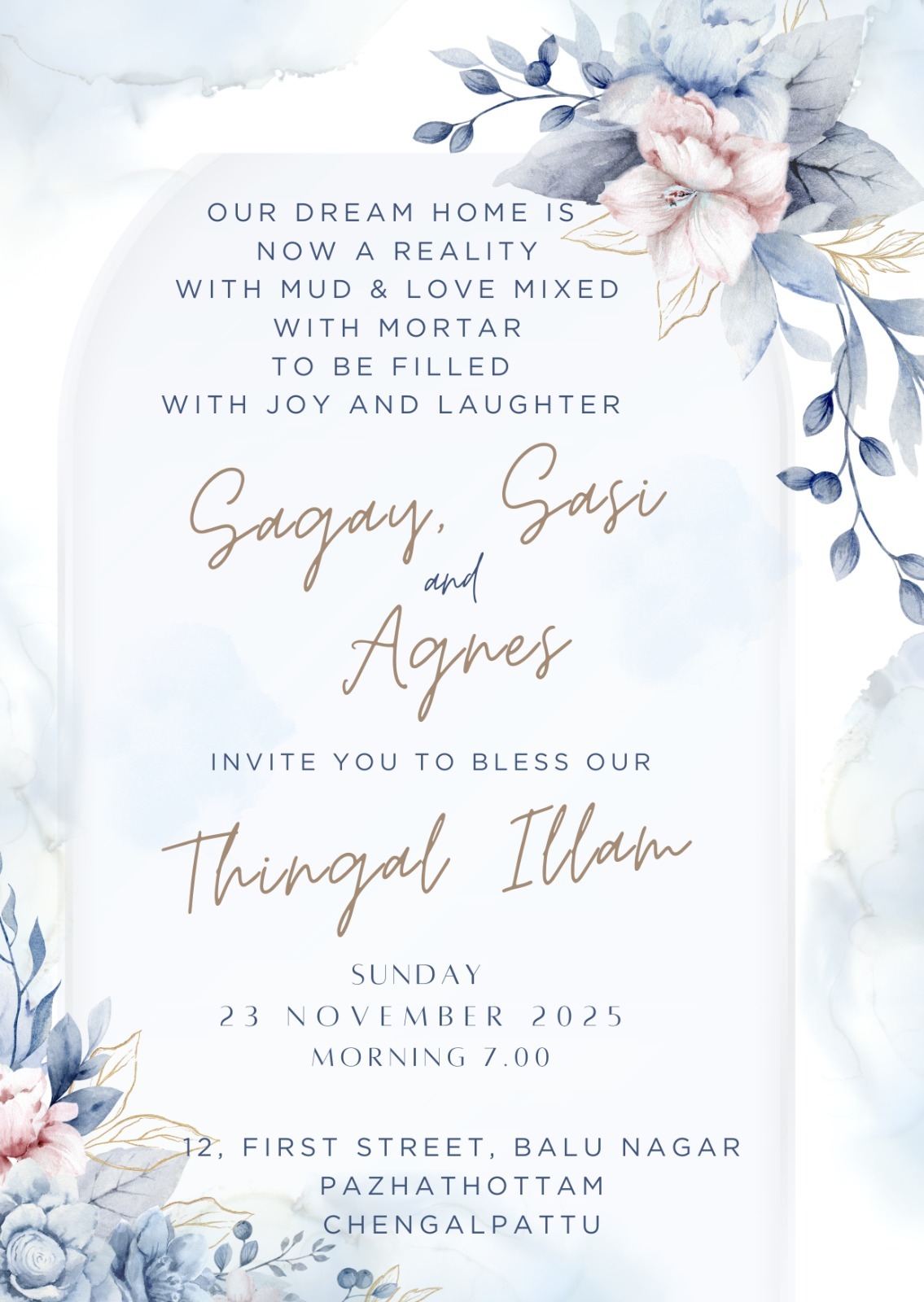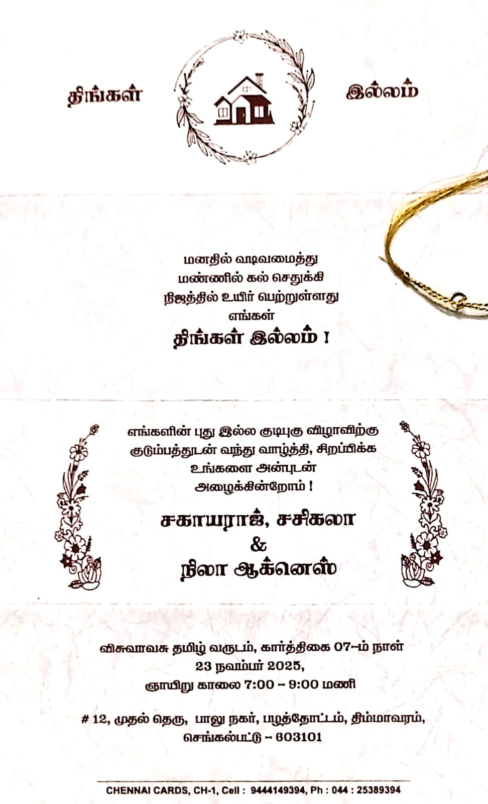 We - Sagayaraj, Sasikala & Nila Agnes - cordially invite you to the house warming ceremony of our new house named 'Thingal Illam'
